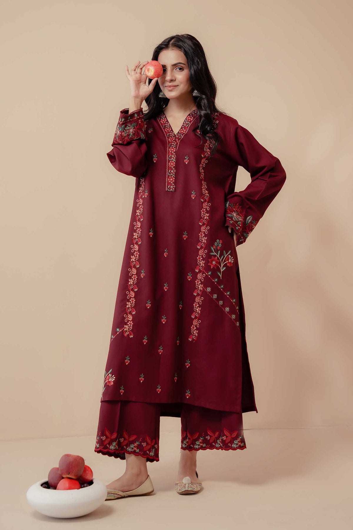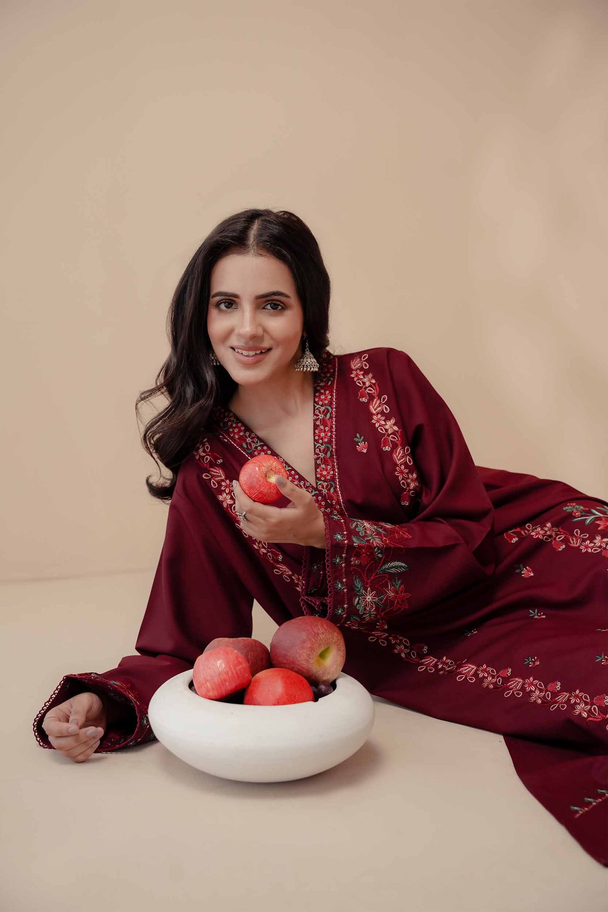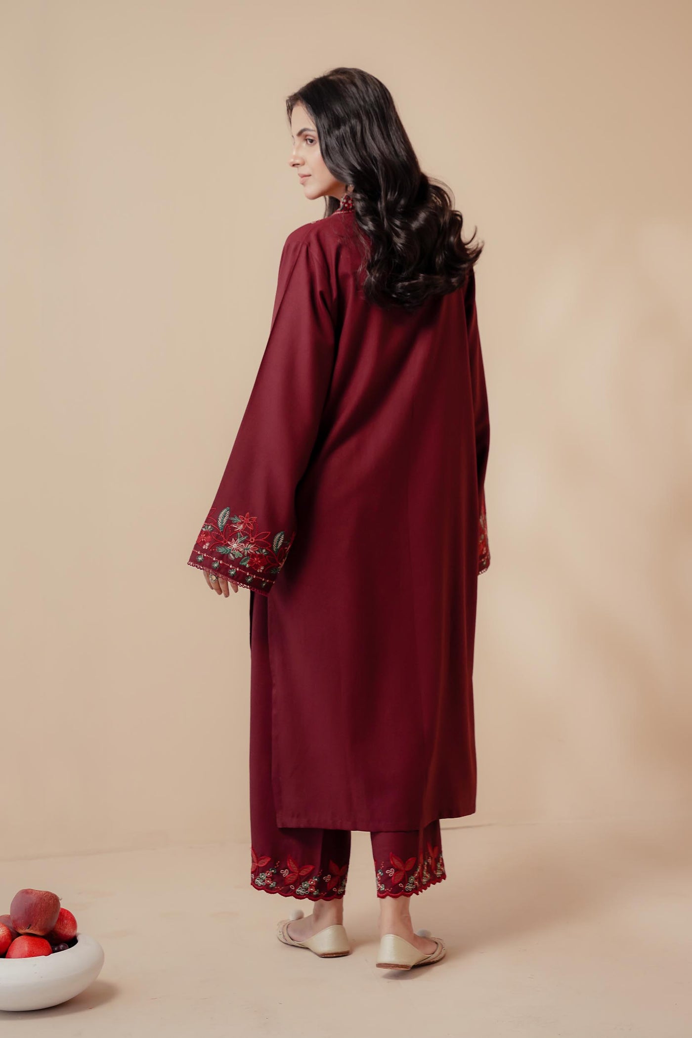 A bold red 2-piece outfit featuring refined embroidery — perfect for making a statement while staying effortlessly elegant this winter season.