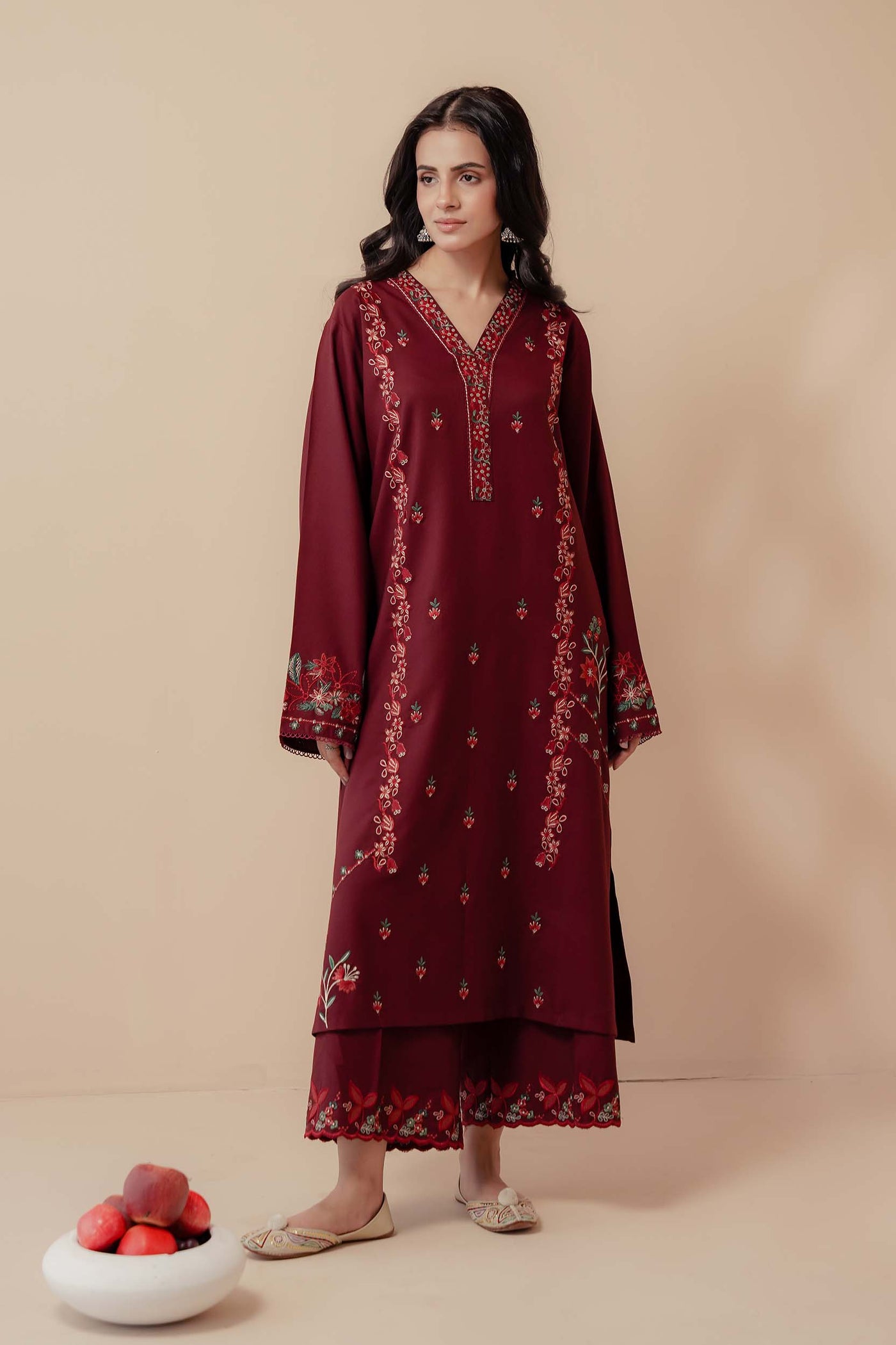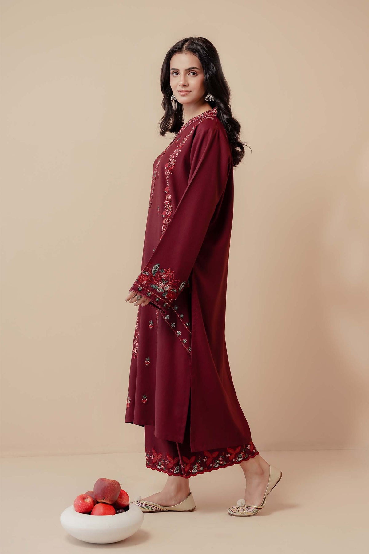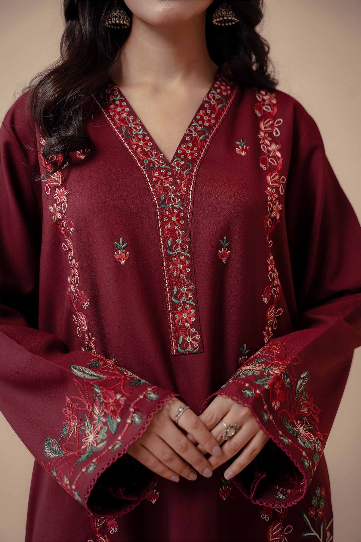 A bold red 2-piece outfit featuring refined embroidery — perfect for making a statement while staying effortlessly elegant this winter season.