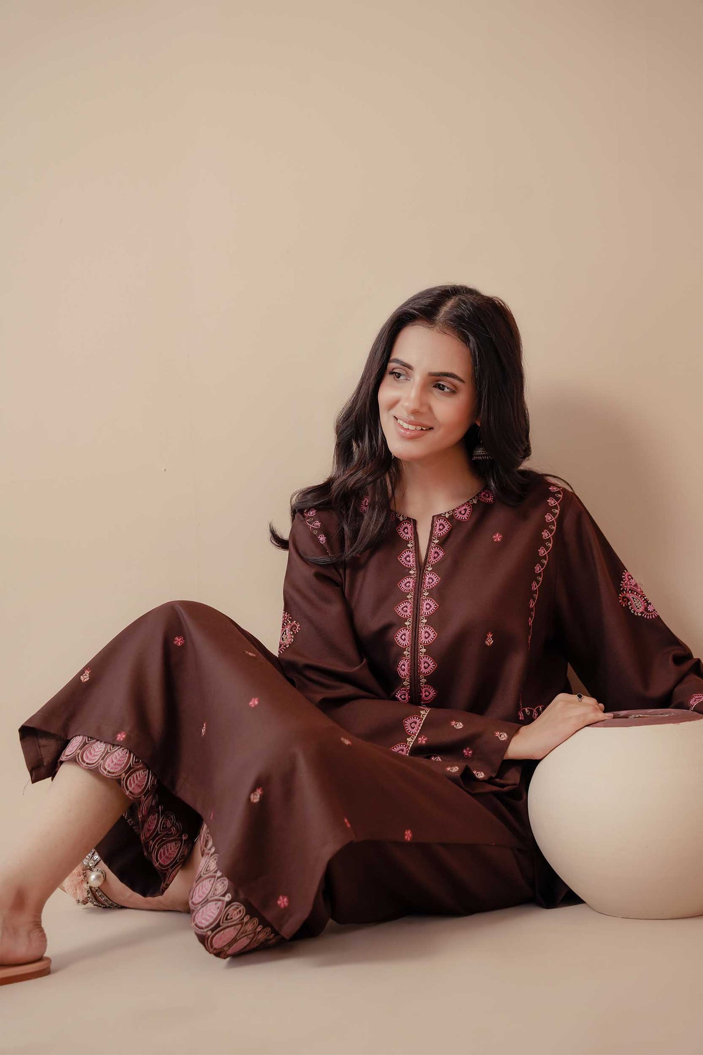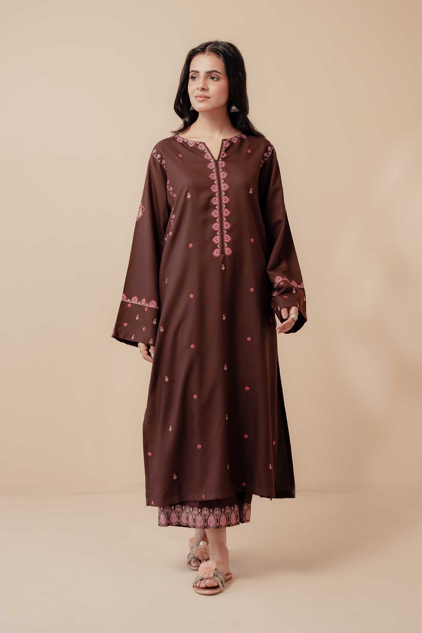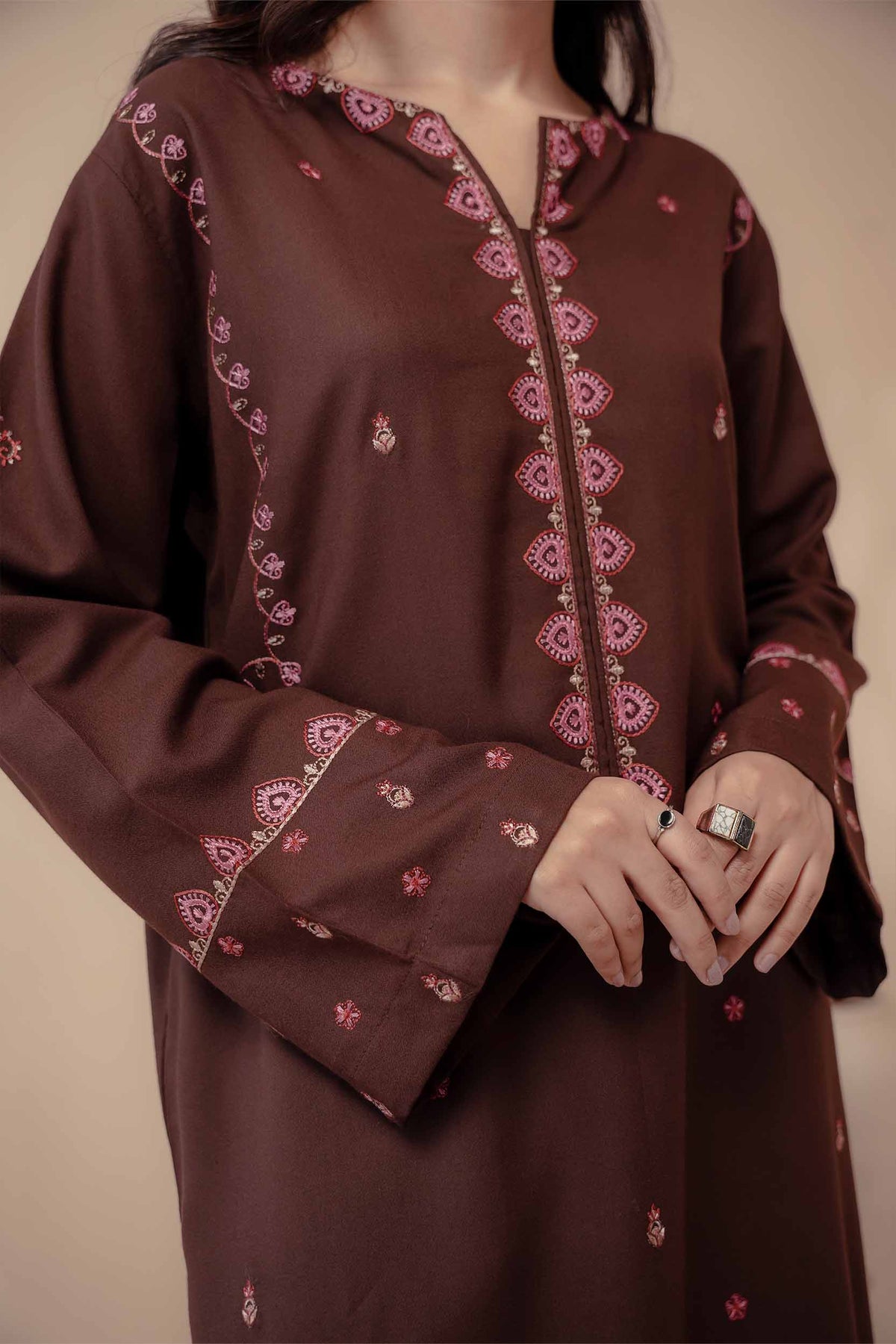 A rich brown 2-piece embroidered outfit exuding sophistication and comfort — the perfect choice for elegant winter days.