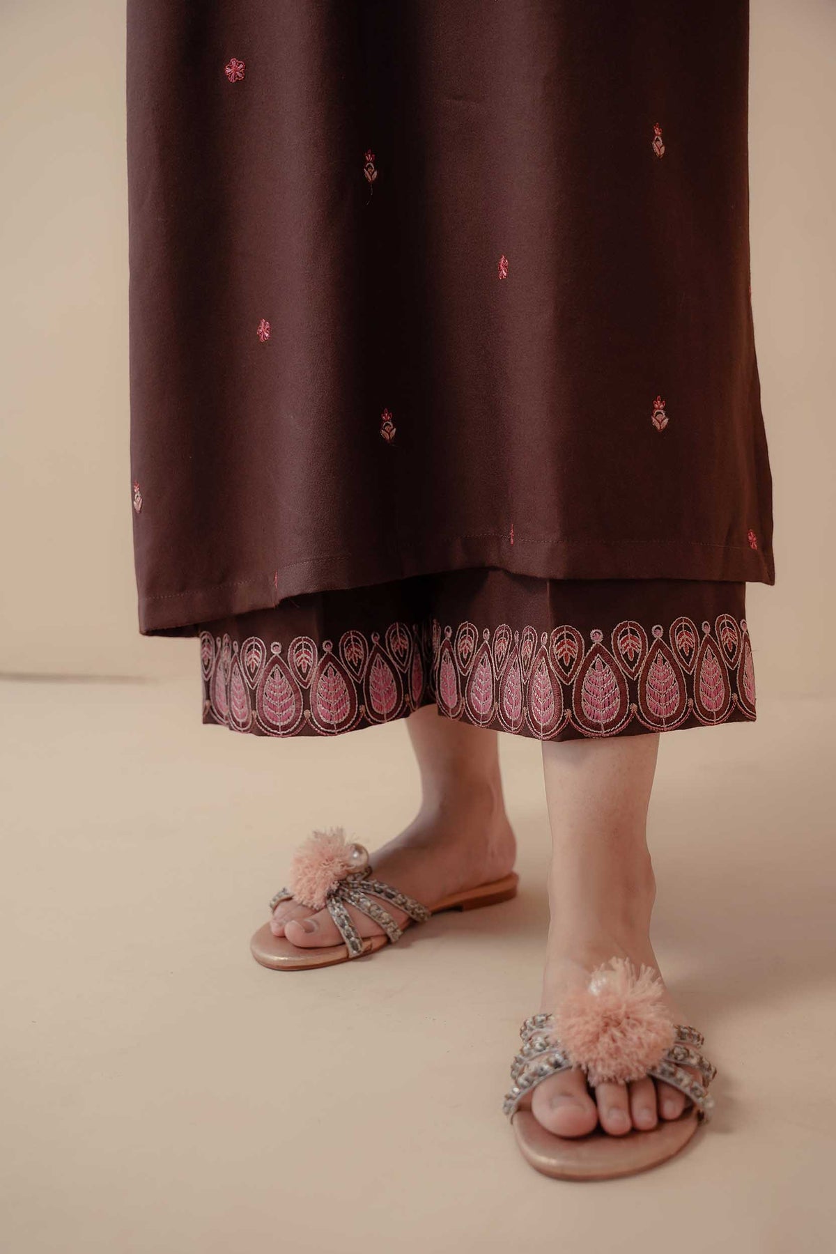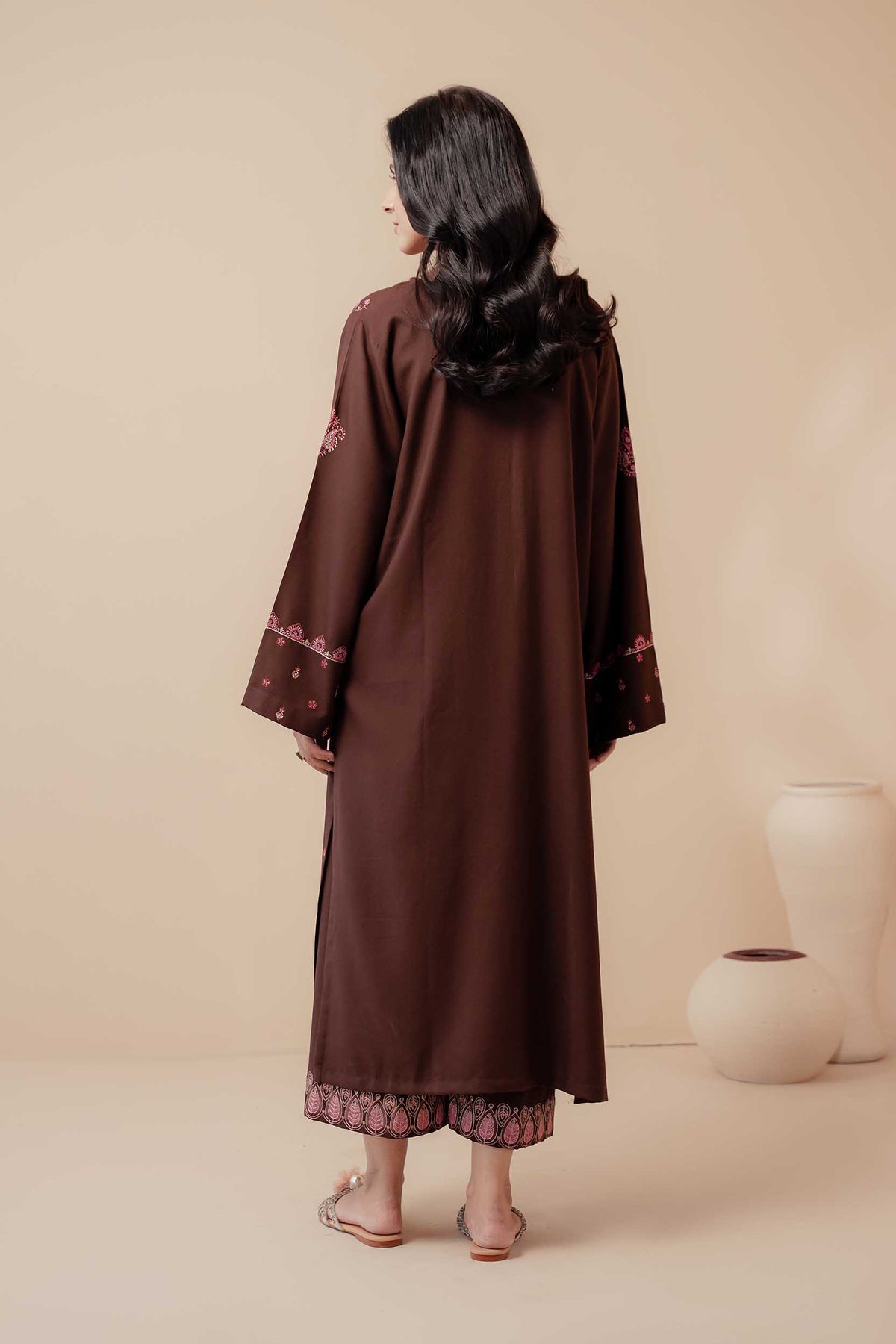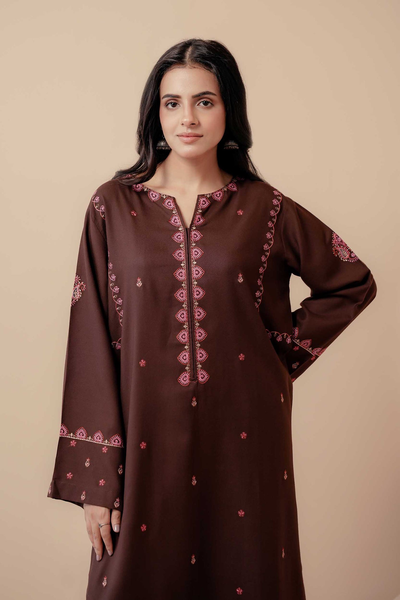 A rich brown 2-piece embroidered outfit exuding sophistication and comfort — the perfect choice for elegant winter days.