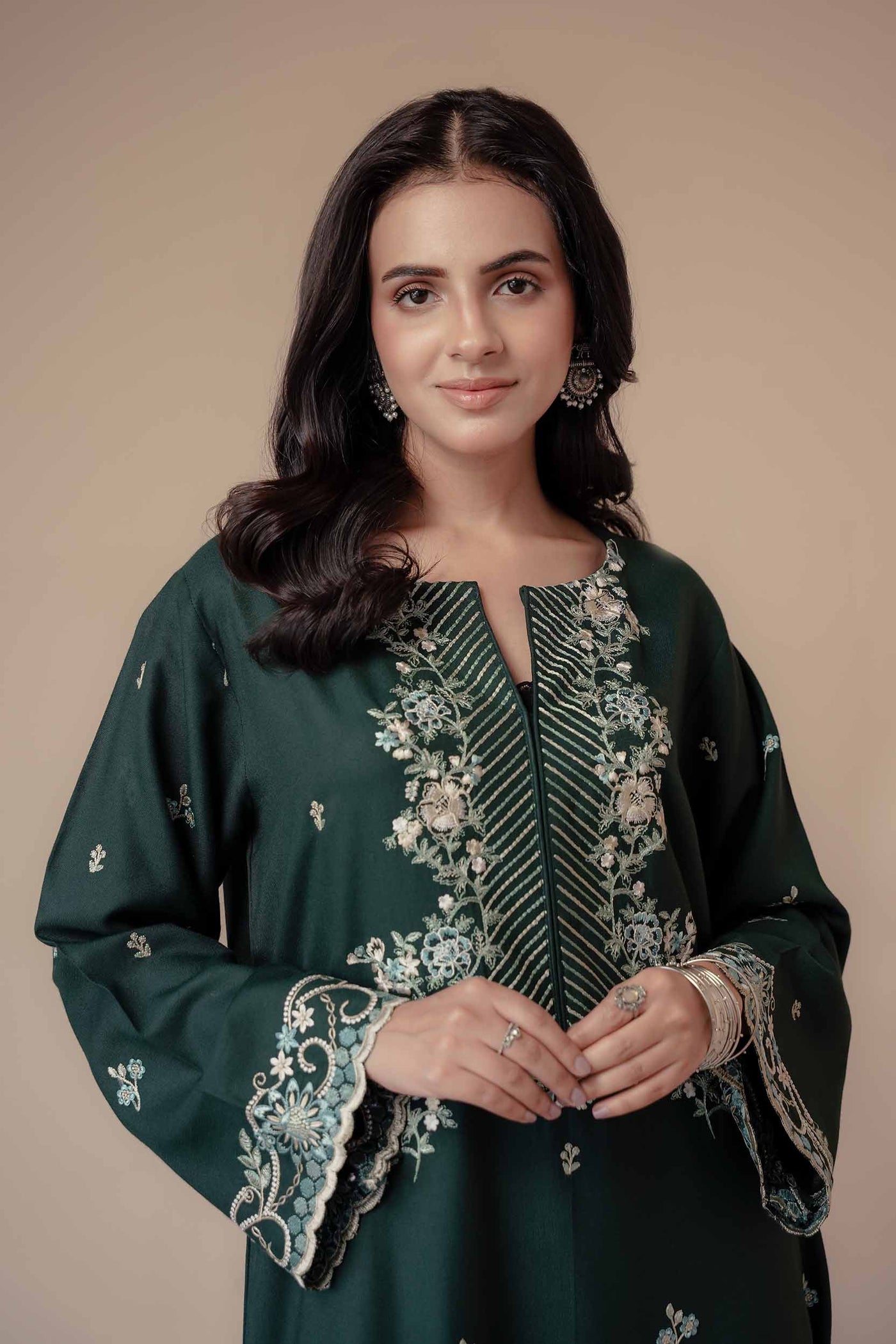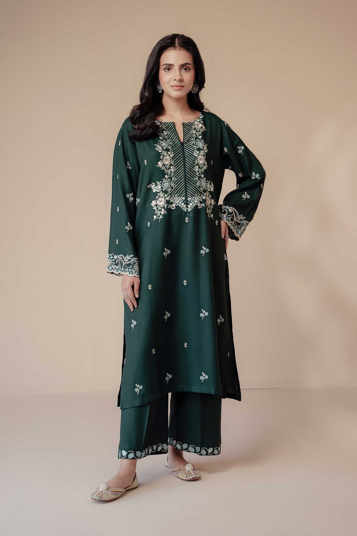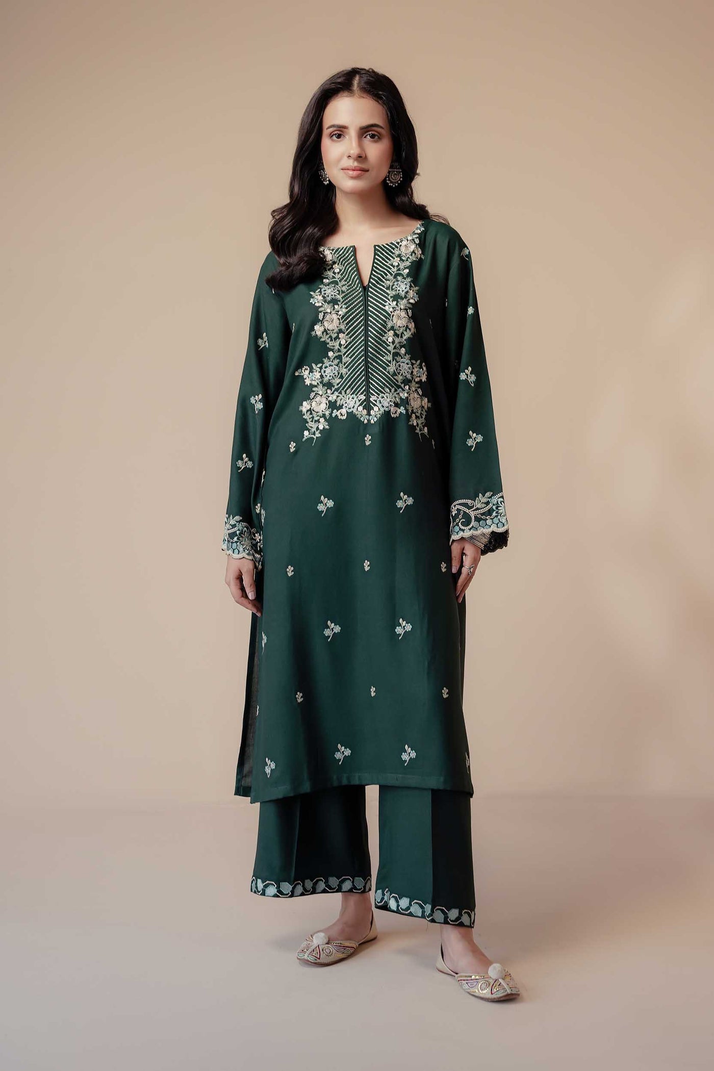 A deep green 2-piece embroidered set reflecting earthy elegance and timeless craftsmanship — a winter classic with contemporary flair.