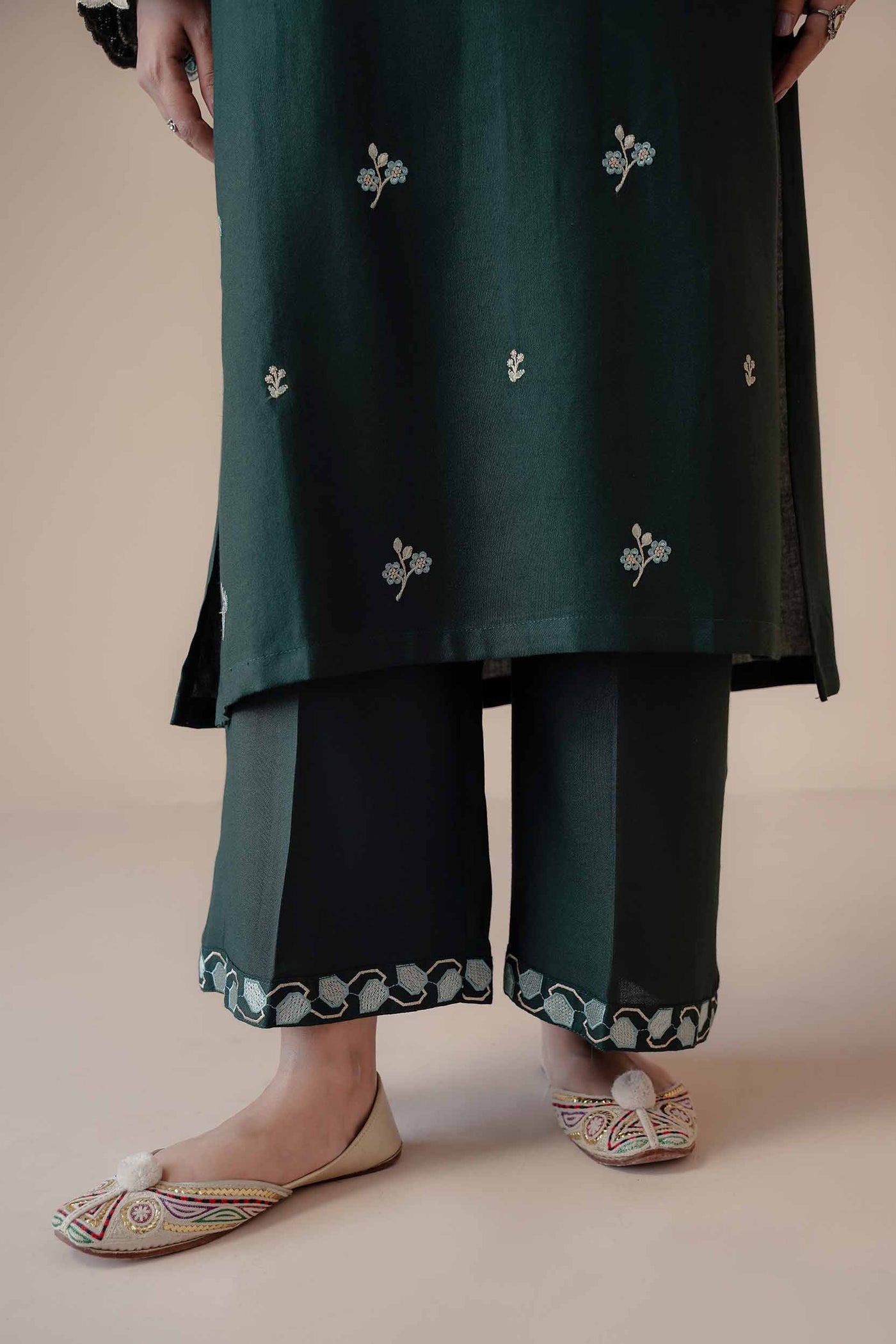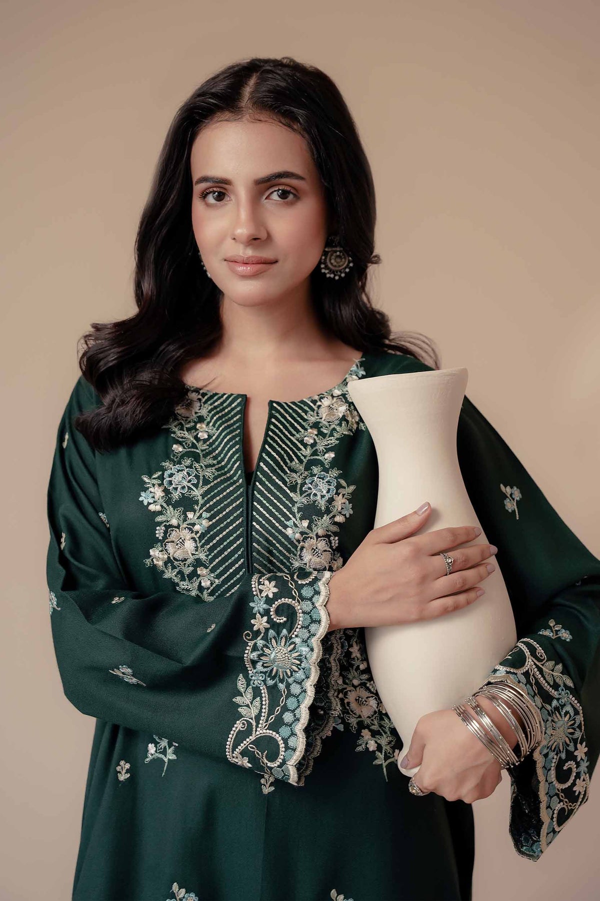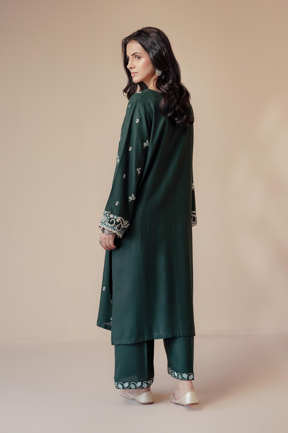 A deep green 2-piece embroidered set reflecting earthy elegance and timeless craftsmanship — a winter classic with contemporary flair.